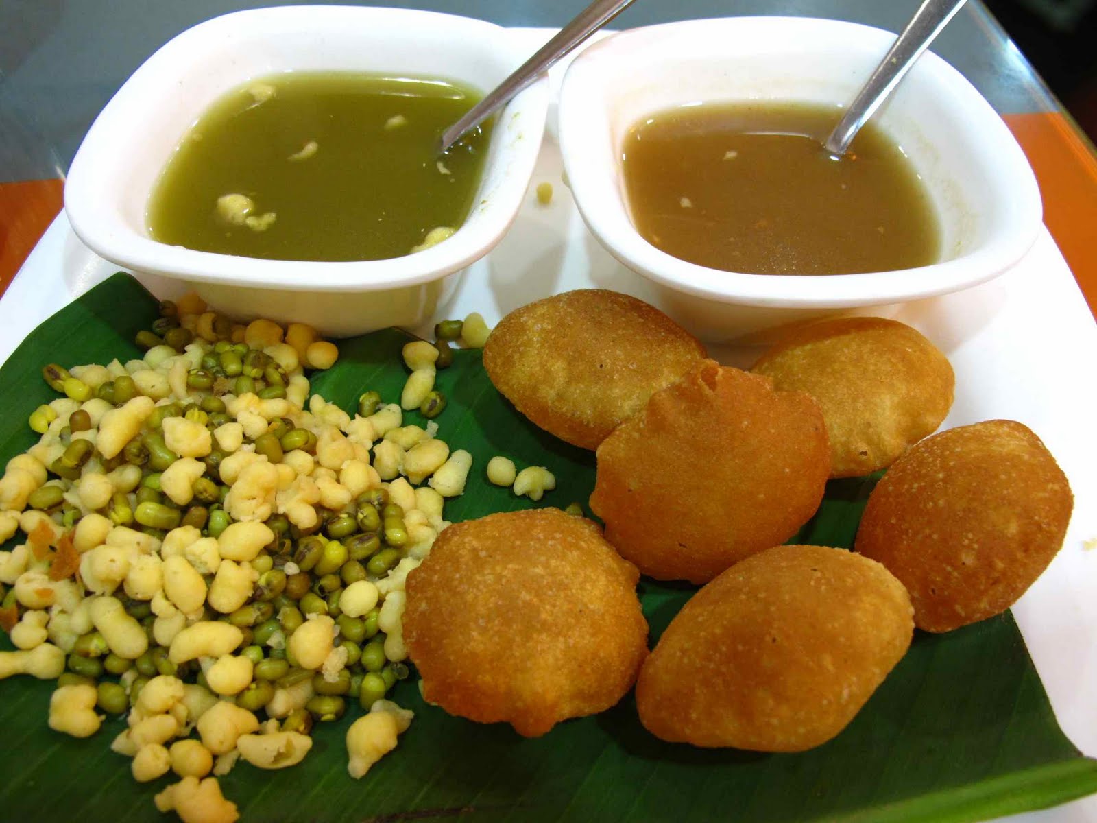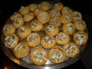 अब एक बड़े कटोरे में मैश किये हुए आलू ,चना , मटर ,मिर्च पाउडर ,जीरा-धनिया पाउडर ,चाट-मसाला ,हरा धनिया और नमक को अच्छे से मिला ले और फिर पुरियो में अपने अंगूठे से छेद कर के मसाला भर दे और ऊपर से बूंदी, सेव, बारीक़ कटा प्याज डालकर चटपटे पानी में डुबोकर पानी पूरी खाने का आनंद उठाये।