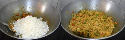 अब सब्जी तैयार हो गयी है इसमें पके हुए चावल मिला दीजिये और जब तक सब्जी और चावल अच्छे से मिल जाये तब तक पका लीजिये , अब आपके तवा पुलाव बनकर तैयार है आप इसे प्लेट में निकालिये और हरे धनिये से गार्निश कीजिये। और फिर दही के साथ खाइये और खिलाइये।